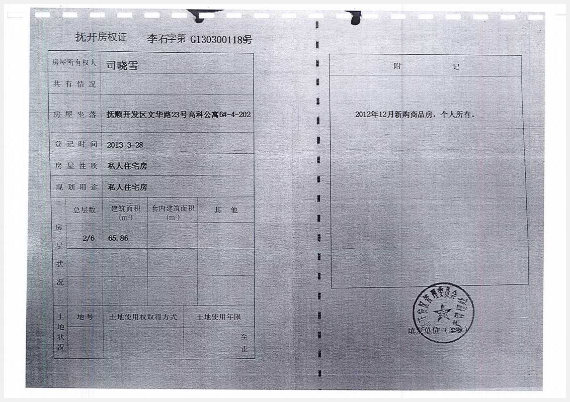 名稱:撫順開發(fā)區(qū)文華路23號高科公寓6#房產(chǎn) 面積:65.86㎡ 瀏覽次數(shù):1325