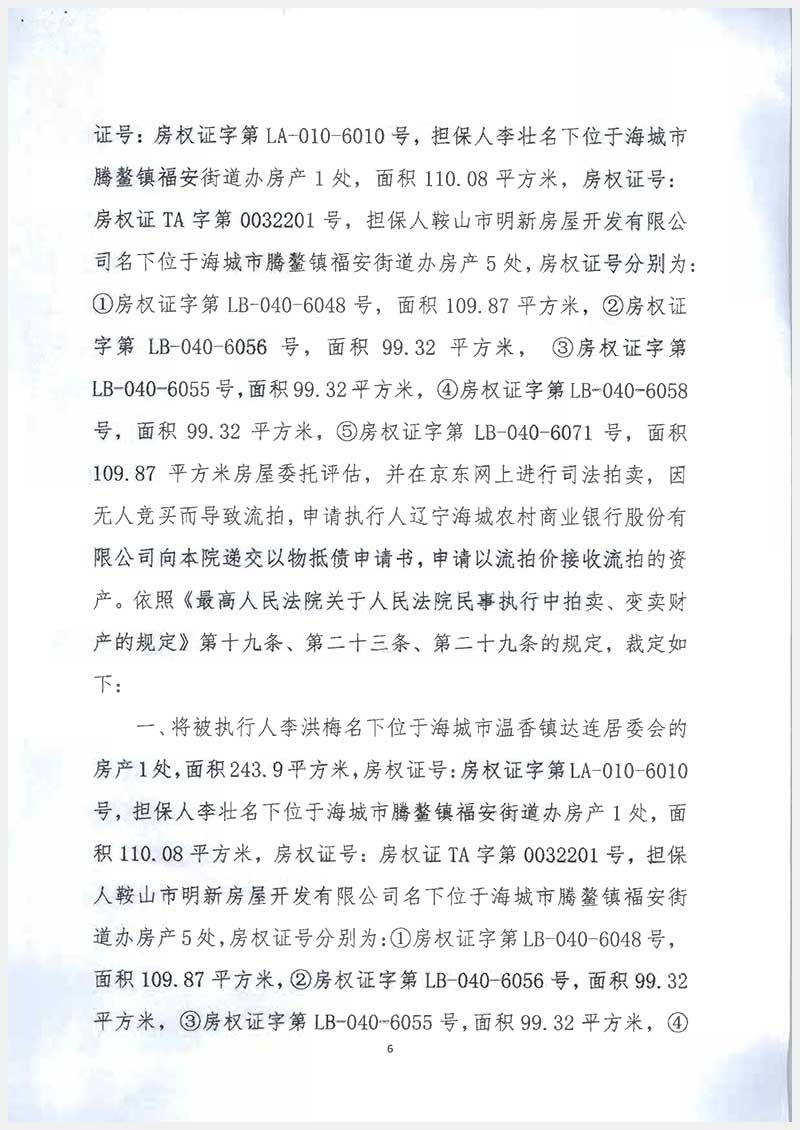 295號(hào) 海城市騰鰲鎮(zhèn)福安街道頤水嘉德二期6處房產(chǎn)