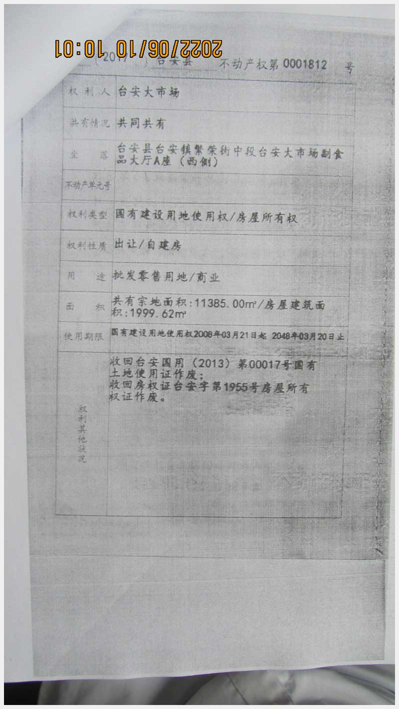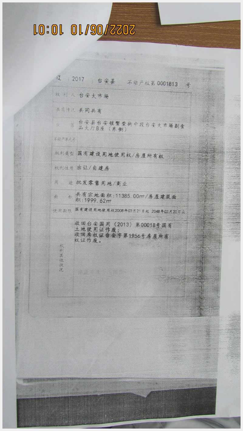 名稱:臺安縣繁榮街中段臺安大市場副食品大廳A座(西側(cè))、B座(東側(cè))房產(chǎn) 面積:1999.62㎡、1999.62㎡ 瀏覽次數(shù):1325