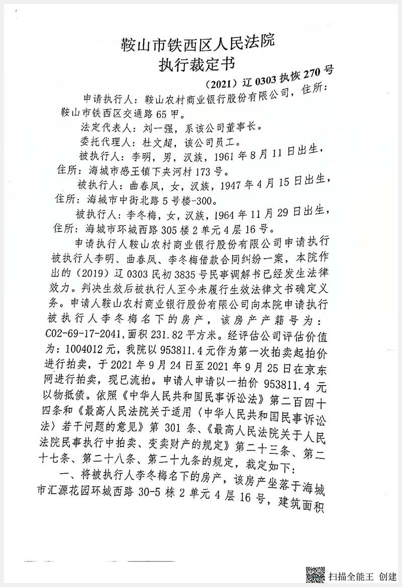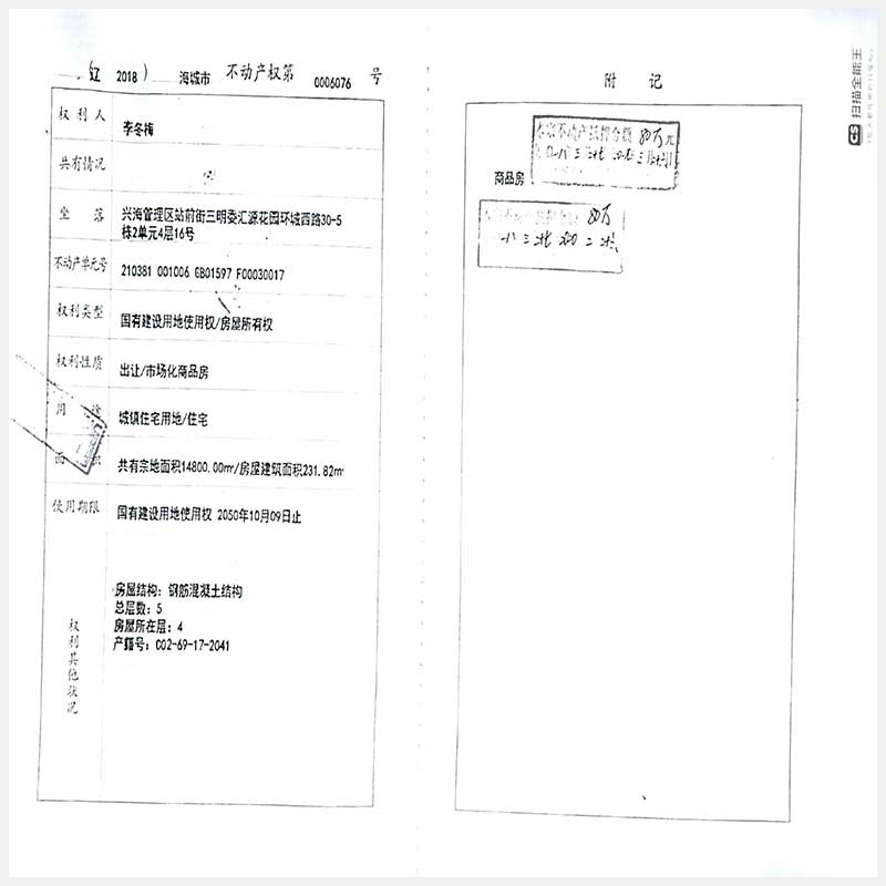 109號(hào) 海城市興海管理區(qū)站前街三明委匯源花園環(huán)城西路30-5棟2單元4層16號(hào)房產(chǎn)