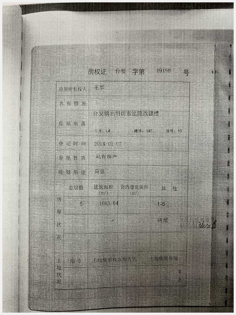 名稱:臺安鎮(zhèn)光明街東原法院開發(fā)樓院內房產(chǎn) 面積:187.95㎡ 瀏覽次數(shù):1370